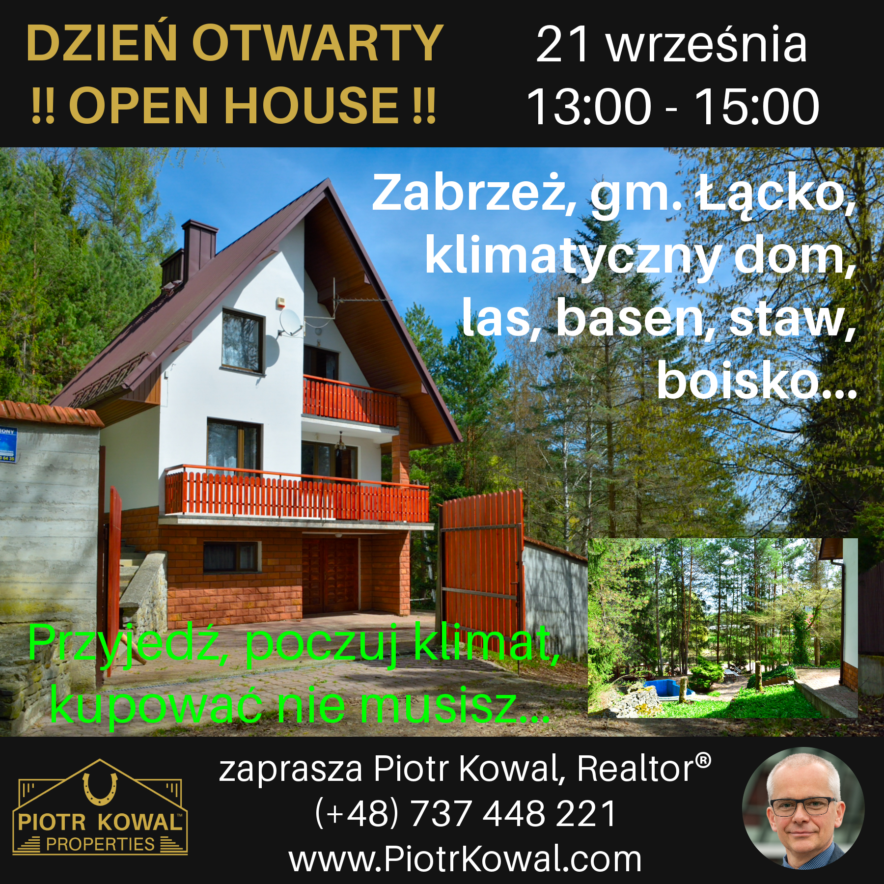 Zapraszam na Dzień Otwarty klimatycznej, zapewniającej niesamowitą prywatność nieruchomości, zlokalizowanej w miejscowości Zabrzeż, w Gminie Łącko: działka 23 ary z lasem, klimatyczny dom, do tego basem, staw rybny, własne boisko. Przyjedź, poczuj ten klimat, kupować nie musisz - kupi ktoś inny. Widzimy się 21 września, czekam na Was w godzinach 13:00 - 15:00 (zadzwoń wcześniej, i zaanonsuj swój przyjazd - dziękuję).