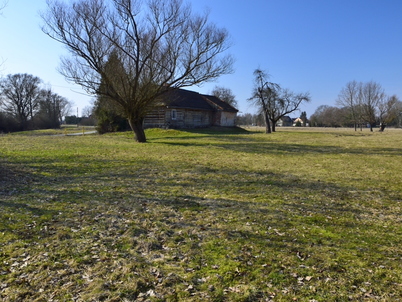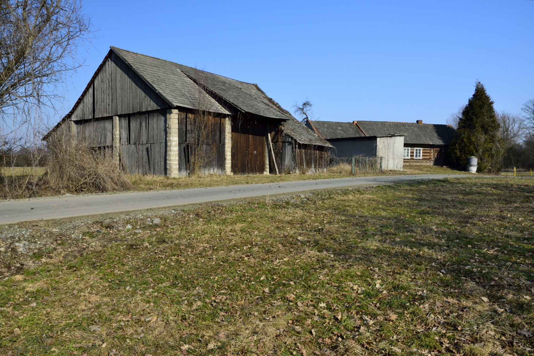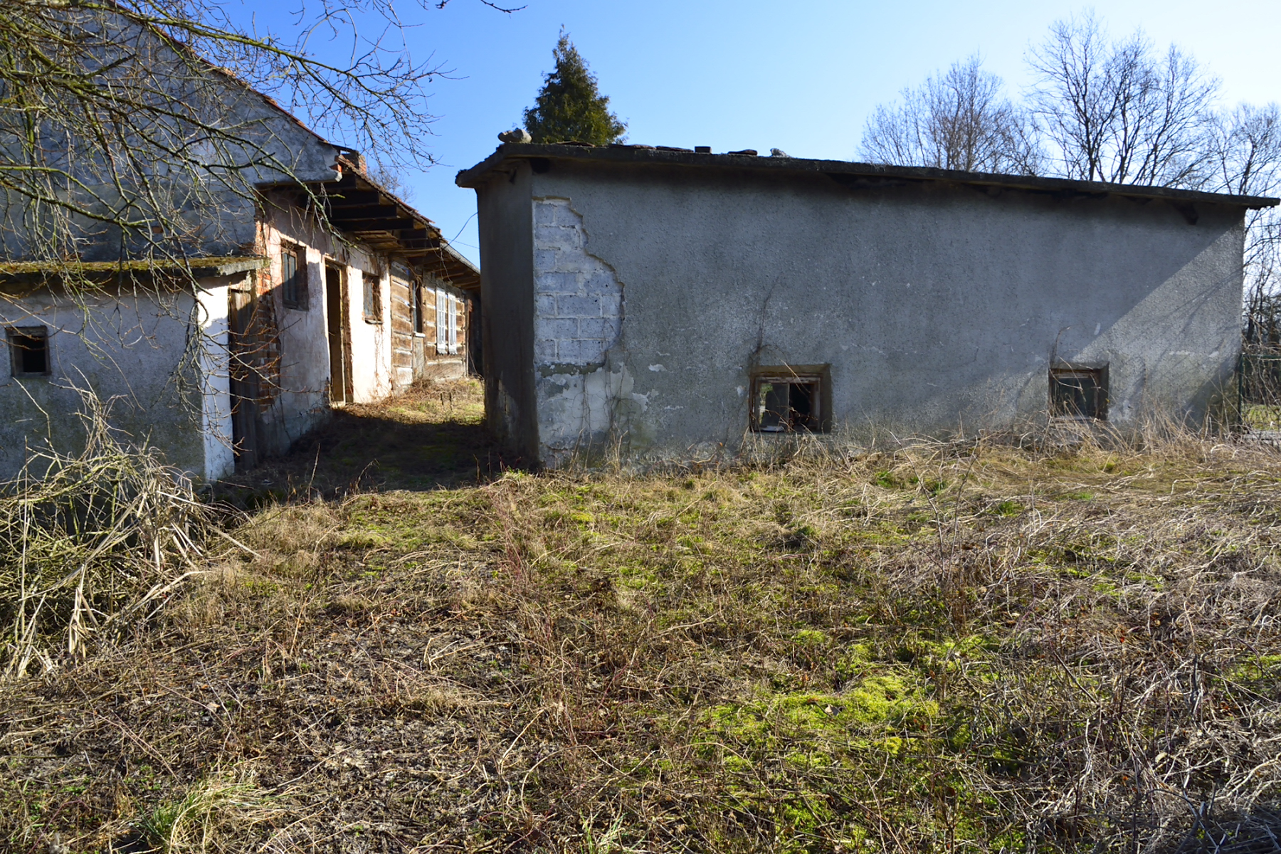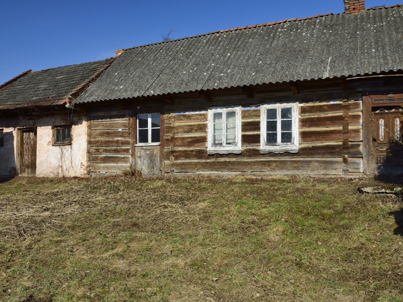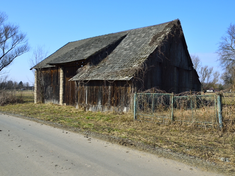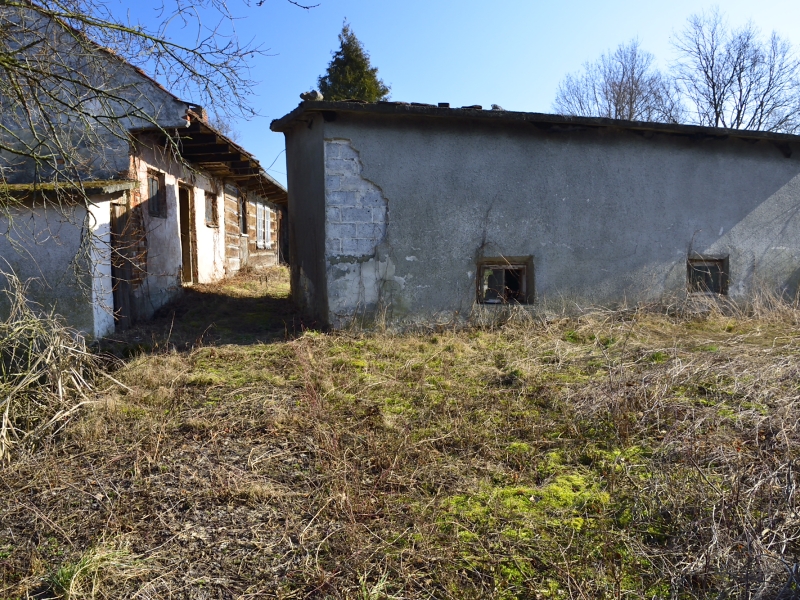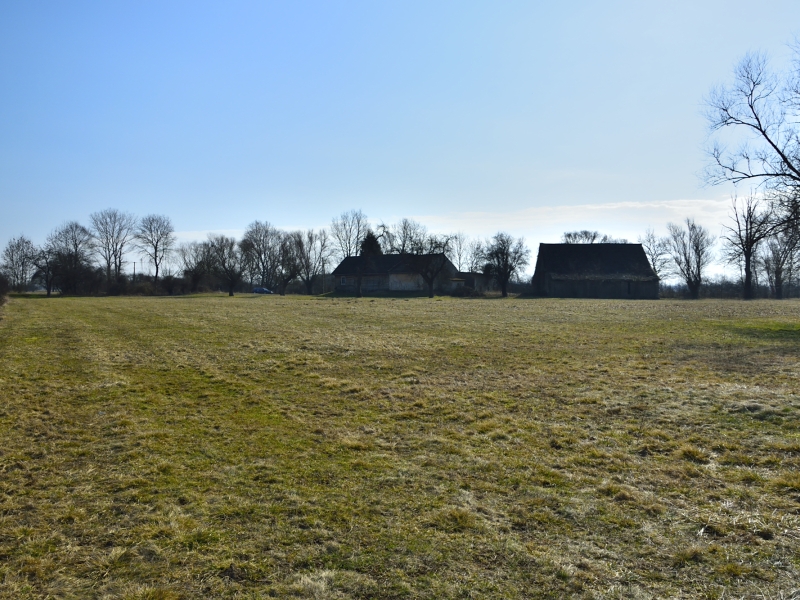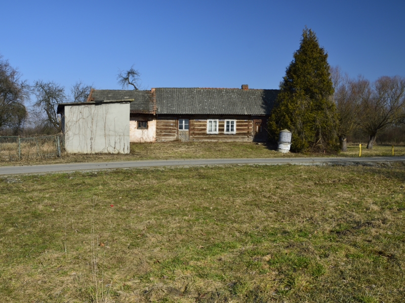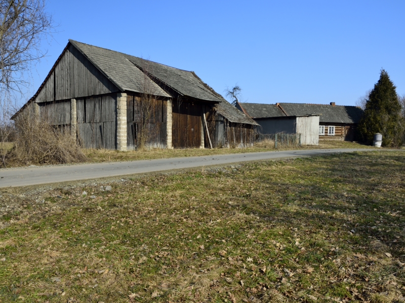 Na jednej z działek, po stronie południowej, bezpośrednio przy drodze o nawierzchni asfaltowej, znajdują się zabudowania: drewniany dom mieszkalny, stodoła, murowany budynek gospodarczy. Są to zabudowania dość stare – niemniej jednak widnieją one w mapach geodezyjnych, a budynek mieszkalny ma nadany numer porządkowy.
