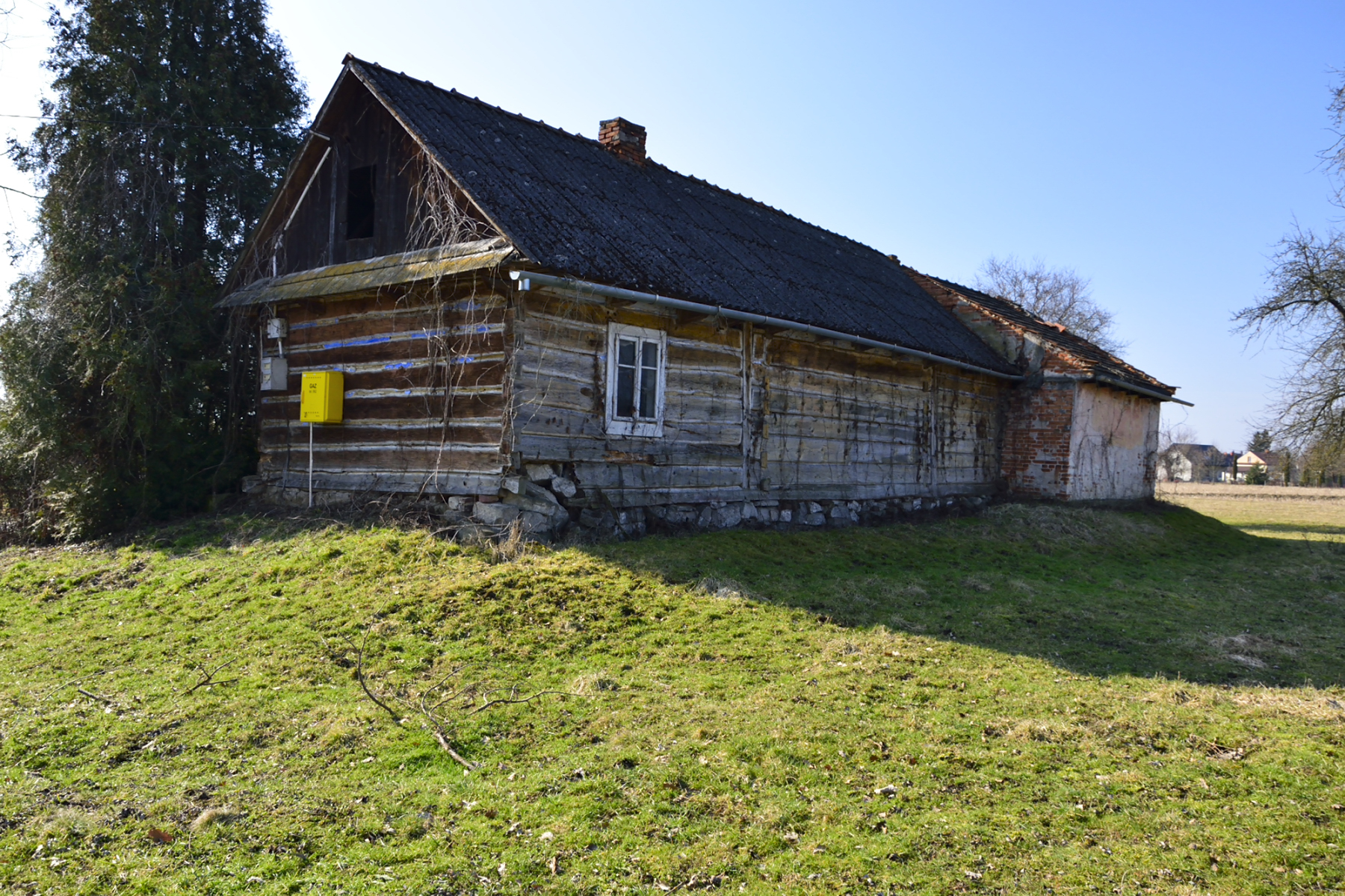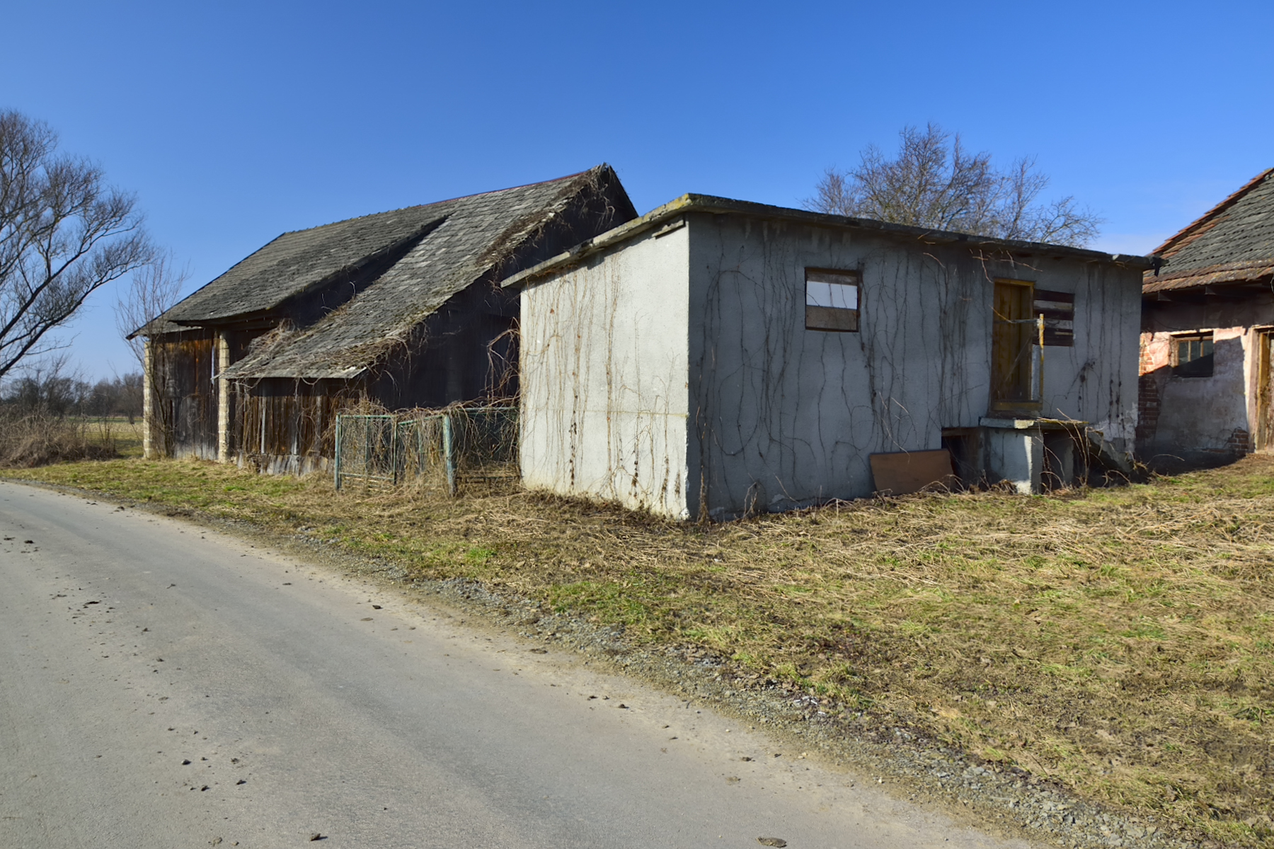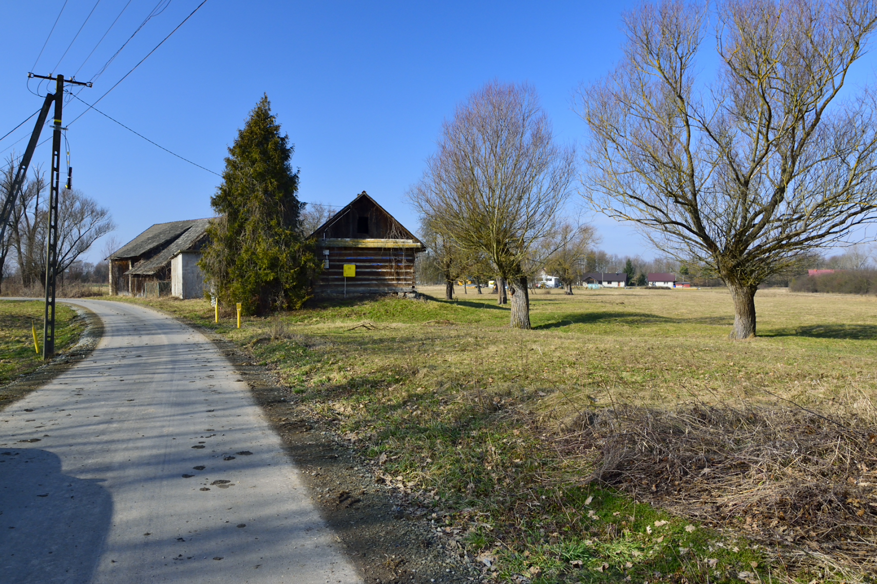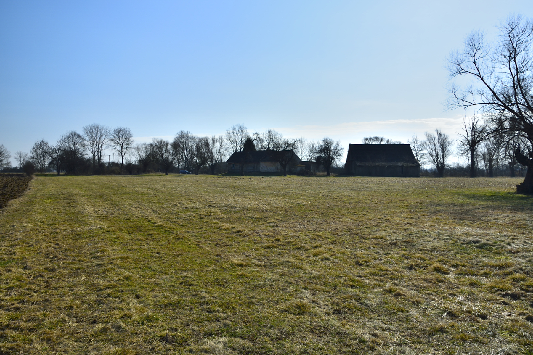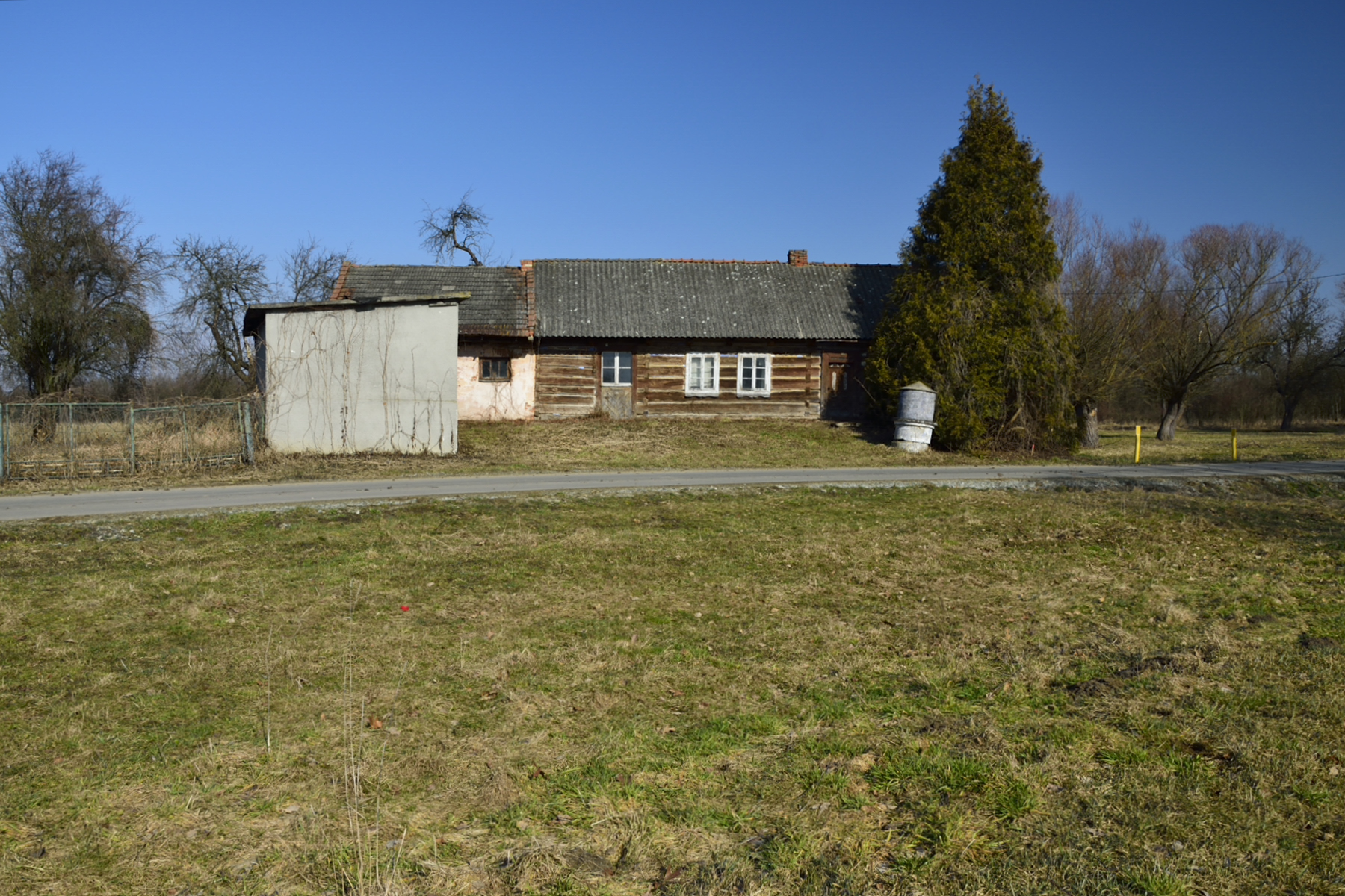 Na jednej z działek, po stronie południowej, bezpośrednio przy drodze o nawierzchni asfaltowej, znajdują się zabudowania: drewniany dom mieszkalny, stodoła, murowany budynek gospodarczy. Są to zabudowania dość stare – niemniej jednak widnieją one w mapach geodezyjnych, a budynek mieszkalny ma nadany numer porządkowy.