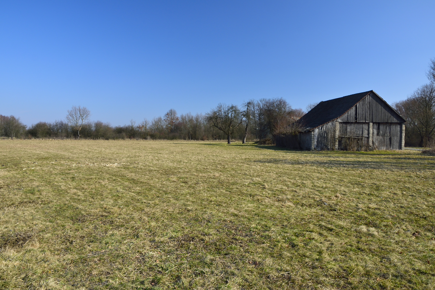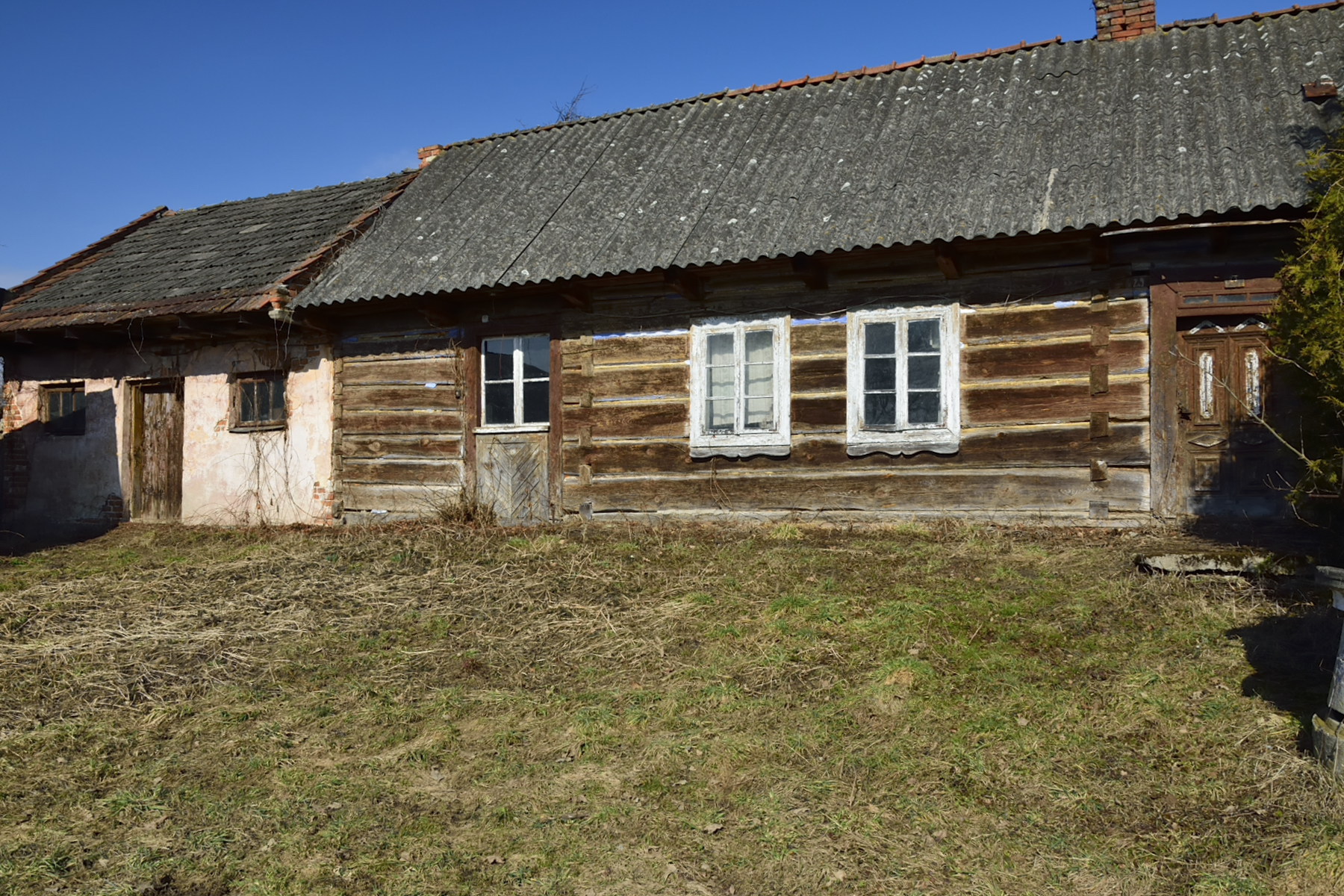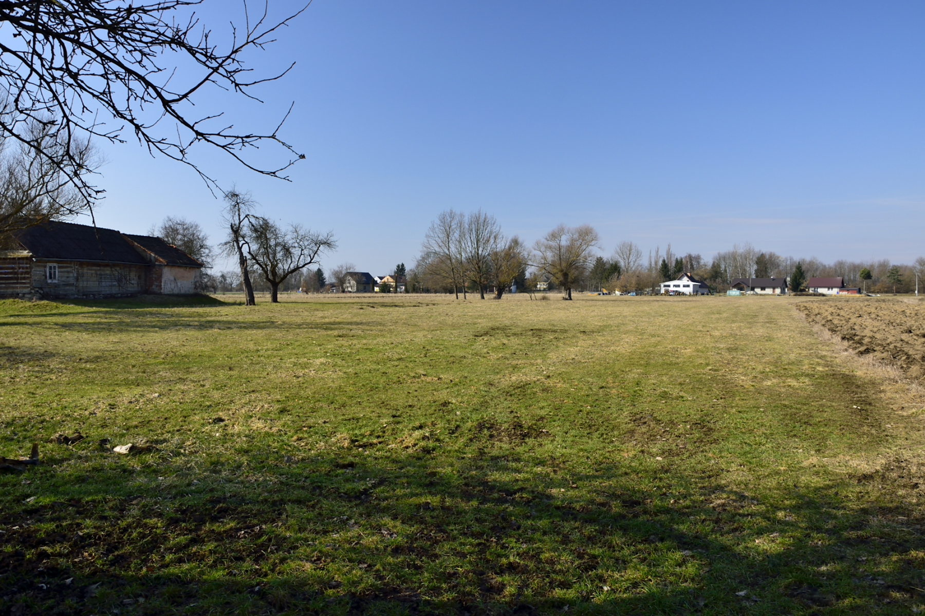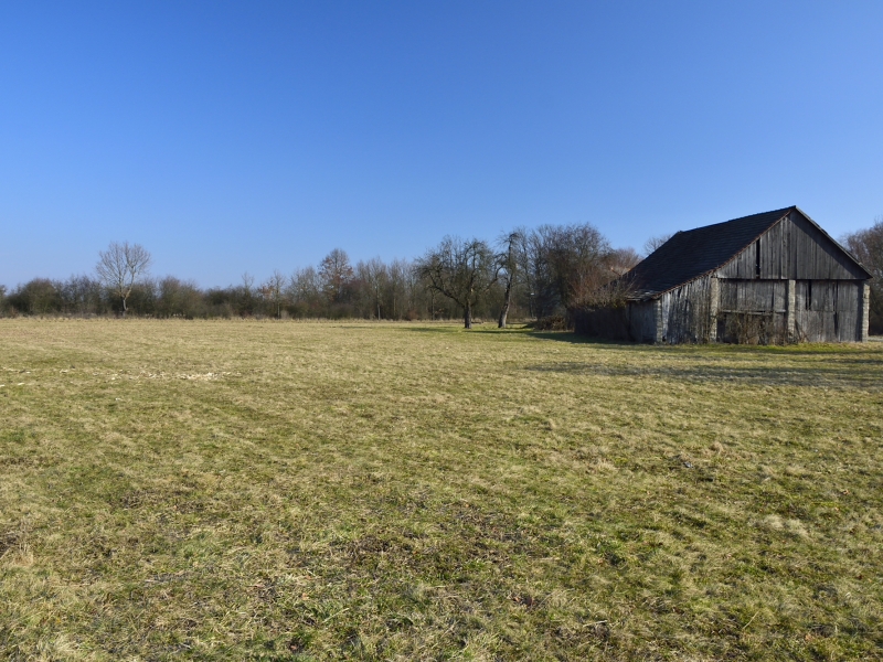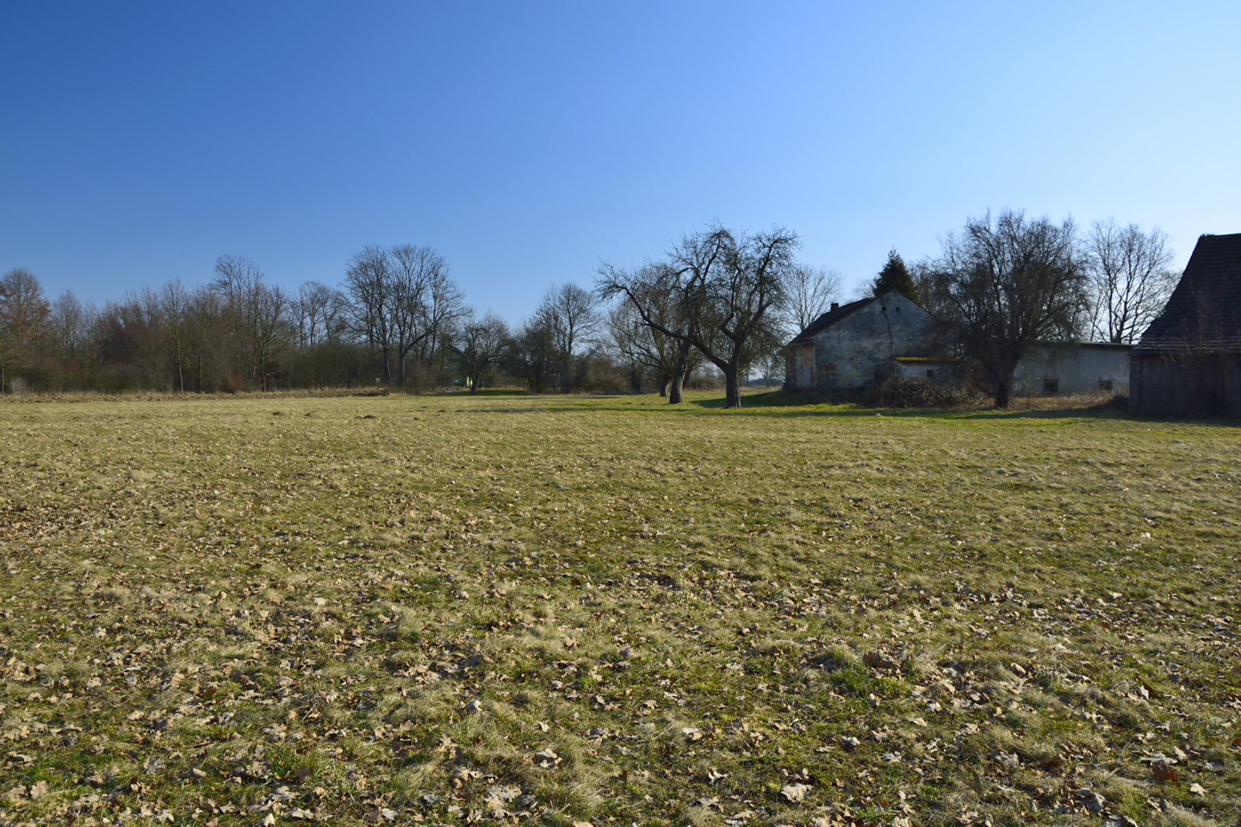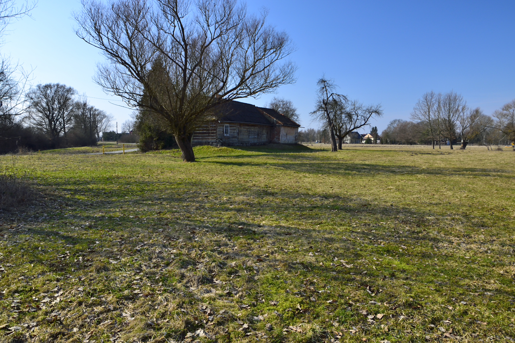 Na jednej z działek, po stronie południowej, bezpośrednio przy drodze o nawierzchni asfaltowej, znajdują się zabudowania: drewniany dom mieszkalny, stodoła, murowany budynek gospodarczy. Są to zabudowania dość stare – niemniej jednak widnieją one w mapach geodezyjnych, a budynek mieszkalny ma nadany numer porządkowy.